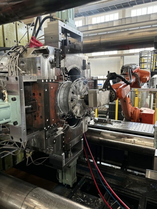 鑫林模具開(kāi)發(fā)的鎂合金一體式后地板模具 在電驅(qū)系統(tǒng)領(lǐng)域,鑫林模具開(kāi)發(fā)的鎂合金電機(jī)殼體模具突破性地達(dá)到與鋁合金同等氣密性標(biāo)準(zhǔn)(泄漏率≤0.5cm³/min)。通過(guò)真壓鑄工藝優(yōu)化,鑄件內(nèi)部孔隙率控制在 2%以內(nèi),首套樣品已搭載于某新能源汽車品牌暢銷車型。 工藝創(chuàng)新:半固態(tài)注射成型的突圍之路 半固態(tài)鎂合金注射成型是近年來(lái)興起并快速推廣的生產(chǎn)工藝。鑫林模具的半固態(tài)注射成型輪轂?zāi)>卟捎弥行狞c(diǎn)進(jìn)料技術(shù),實(shí)現(xiàn)了三大突破:?jiǎn)吻蛔⑸淞客黄苽鹘y(tǒng) 17.5kg 的上限,能夠滿足 20 寸以上大型輪轂的生產(chǎn)需求;在出品率方面革新,通過(guò)動(dòng)態(tài)溫控系統(tǒng),將材料利用率從 65%提升至 85%;在性能上躍升,輪轂抗拉強(qiáng)度大幅提升,超過(guò)了鋁合金的標(biāo)準(zhǔn)。