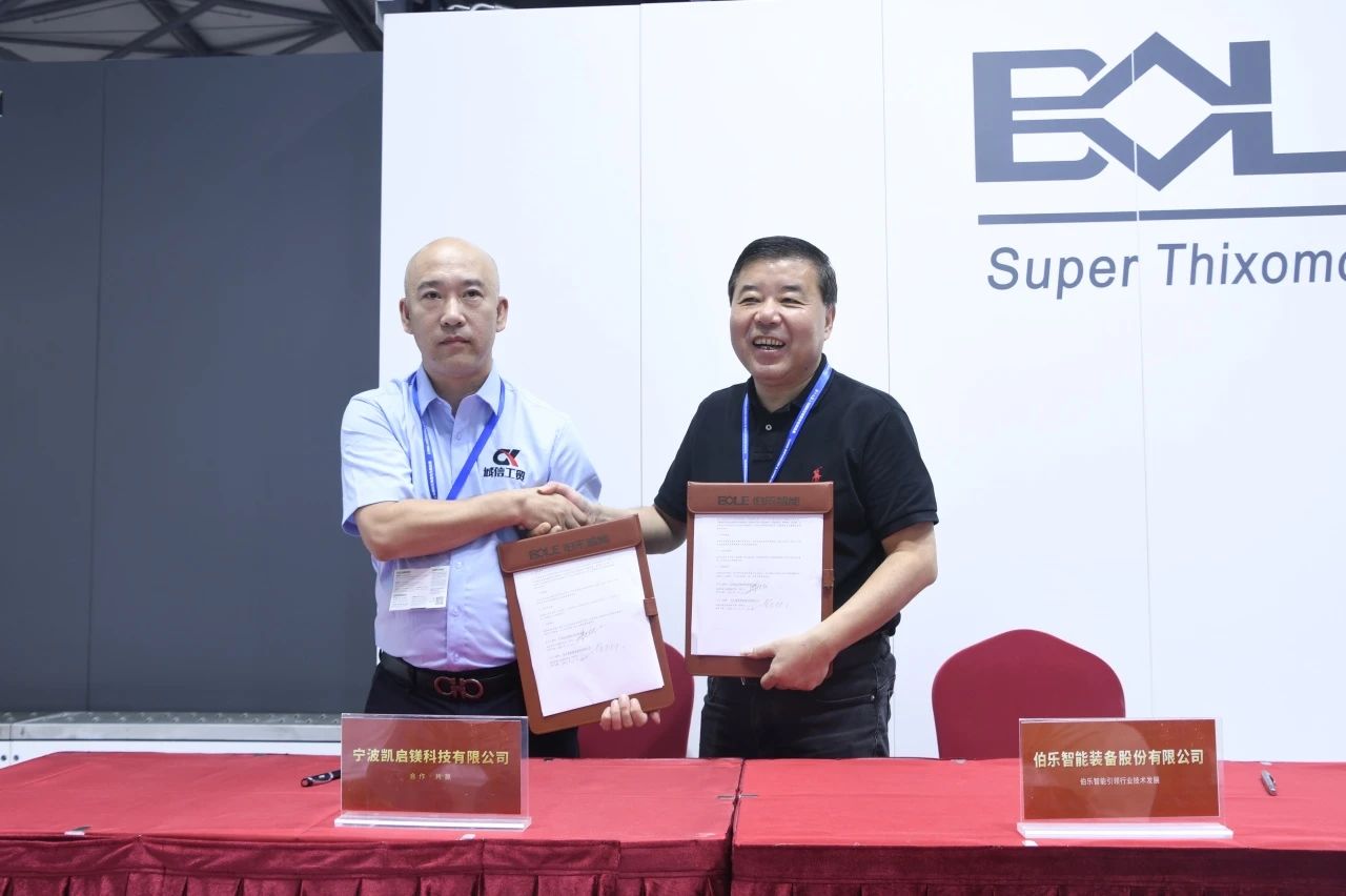 展會盛況 工藝革新:采用半固態觸變成型技術,將鎂合金顆粒加熱至半固態后直接注射,無需熔爐與保護氣體,從源頭消除氫脆、氧化夾雜等缺陷,產品良率從傳統工藝的75%提升至95%,單件生產周期縮短40%。 能效躍升:通過伺服電機與液壓系統深度耦合設計,配以專利的特殊軟件算法設備能耗較傳統壓鑄降低35%,單臺年節電量相當于減少碳排放800噸,契合歐盟碳關稅(CBAM)等國際綠色貿易壁壘要求。 應用拓展:伯樂智能成功試制新能源汽車鎂合金電機殼體,實現鎂合金在高壓電機核心部件的首次規模化應用,較鋁合金減重35%、散熱效率提升20%,為800V平臺熱管理提供關鍵解決方案;同步突破鎂合金輪轂等部件的半固態成型工藝,形成覆蓋動力、底盤系統的全場景輕量化技術矩陣。 02 戰略簽約:五大巨頭共筑“鎂基價值鏈”