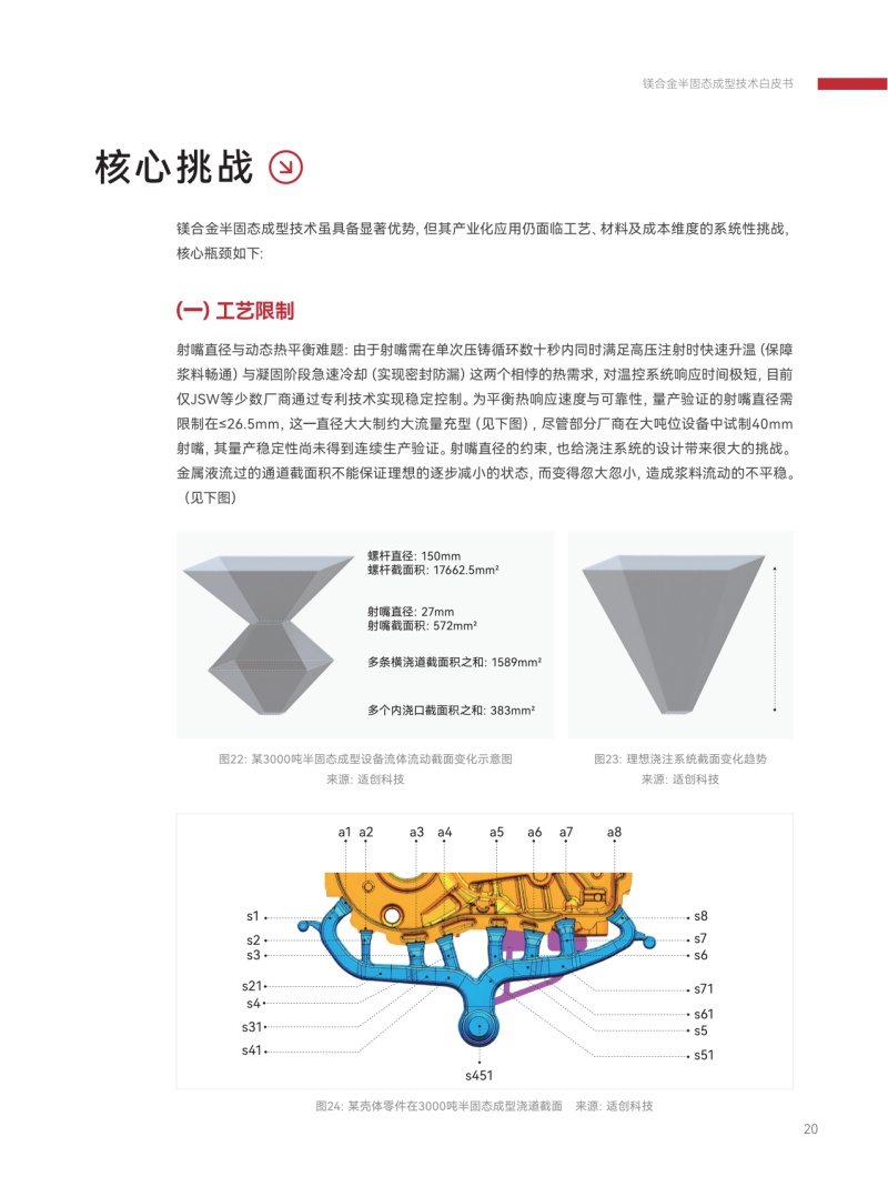 《鎂合金半固態(tài)成型技術(shù)白皮書(shū)》部分內(nèi)容 主題演講持續(xù)2天,現(xiàn)場(chǎng)座無(wú)虛席,吸引了眾多關(guān)注輕量化解決方案的參展者參加。 適創(chuàng)科技薛鵬基總監(jiān)結(jié)合白皮書(shū)內(nèi)容,深入剖析了該技術(shù)在實(shí)現(xiàn)復(fù)雜、薄壁、高強(qiáng)輕量化部件制造上的獨(dú)特優(yōu)勢(shì),特別是在新能源汽車(chē)、3C電子、人形機(jī)器人等對(duì)減重和性能要求嚴(yán)苛領(lǐng)域的巨大潛力。同時(shí),薛鵬基總監(jiān)詳細(xì)闡述了當(dāng)前工藝面臨的核心約束與挑戰(zhàn),指出該技術(shù)產(chǎn)業(yè)化推廣的主要難點(diǎn)。