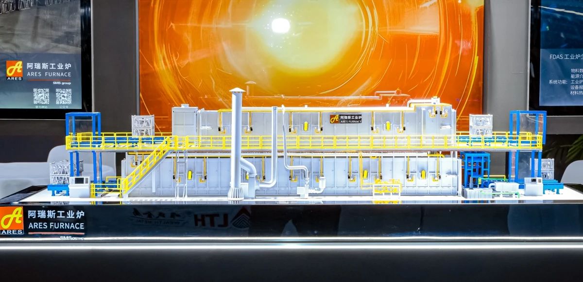 現場展示的雙層鋁合金T6連續熱處理線模型 • 結構緊湊,空間極致利用:創新地采用固溶爐與時效爐雙層疊加的設計,優化了燒嘴和料位布局、側風箱和側向對開門布局,有效降低了設備高度并充分利用了爐內空間,提高了場地利用率。 • 高效能耗控制,保障產品品質:專利的對開爐門設計大幅縮短了工件淬火轉移時間,并且通過精準控溫確保了鑄件組織和性能的一致性,提升了產品合格率。低能耗設計加上余熱利用系統不僅減少了能源消耗,還降低了生產成本,實現了經濟效益和環保效益的雙重收益。 • 智能生產自動化控制:配備的智能控制系統集成了可視化監控、能耗統計分析、生產數據統計及數字模型等功能,可實時采集并分析生產信息,支持數據查詢與生產過程追溯。助力企業實現精細化管理和工廠數字化轉型。