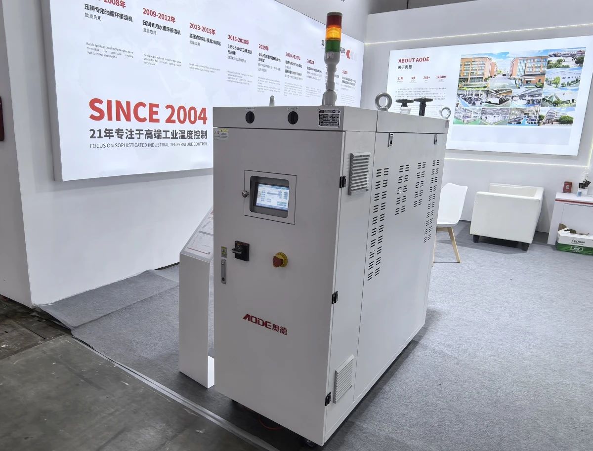 ![]() 奧德高端裝備參展團隊 在壓鑄生產中,溫控設備發揮著重要的作用。它通過精準控制模具溫度,在提升產品質量、提高生產效率、強化設備保護等多方面為生產提供堅實保障,是現代化壓鑄生產線中不可或缺的輔助設備。蘇州奧德高端裝備股份有限公司(簡稱“奧德高端裝備”)在溫控設備領域深耕多年,憑借持續的創新和豐富的經驗,在行業口碑和市場占有率方面表現卓越,已然成為國內溫控行業的領軍企業。 在日前閉幕的第十九屆上海國際壓鑄暨有色鑄造展上,奧德高端裝備展示了其技術成熟、行業領先的應用于壓鑄行業的全套模溫控制系統,涵蓋180℃壓鑄專用水溫機、320℃壓鑄專用油溫機、高壓點冷機等,以及針對鎂合金半固態成型、大型一體化壓鑄的溫控解決方案。