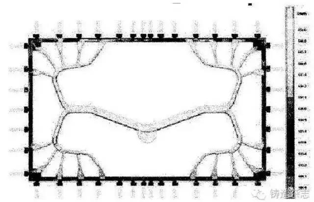 圖1 高壓壓鑄件框架 “這個鑄件充型時金屬液需要流動幾米長的距離,能完全充滿嗎?”項目經理AxelSchmidt問道。“完全充滿需要多少時間?如果金屬液流動前端流動了2~3 m后相遇,會發生什么情況?流動長度的變化會有多大?大量的內澆口施加在框架上的拉力有多大?我們必須在開始工作的早期就以一種成本效益好的方式回答這些問題。” DGS選擇A360鋁合金作為框架鑄件的材料,因為這種合金強度高,韌性好。項目工程師決定這個薄壁框架零件具有“Z”字形的橫截面。但是對于這種大型薄壁設計這種形狀的零件有很大困難。 最初,DGS項目團隊設計了一個有兩條主線的澆注系統。隨后工程師采用模擬軟件評估了這個設計的關鍵問題,如流動長度、充型溫度,以及通過虛擬實驗手段評估物質痕跡,并進行優化。最初的模擬結果顯示這個設計主要的問題是變形。框架面的變型量達到9 mm,遠遠超過了客戶的規定變形量。DGS的工程師決定完全重新設計澆注系統,并且檢查修改設計的效果。最終設計的澆注系統有20個內澆口,主要分布在4個角部區域,成功地防止了嚴重的變形(圖2)。