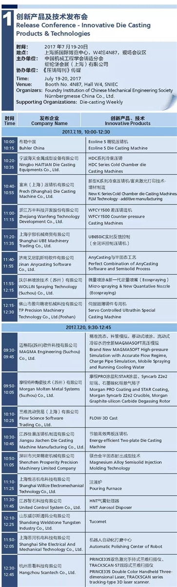 由中國機械工程學會鑄造分會、紐倫堡會展(上海)有限公司主辦,《壓鑄周刊》傳媒協辦的“創新產品及技術發布會”,系『CHINA DIECASTING2017中國壓鑄展』的創新品牌活動。活動旨在挖壓鑄行業掘新產品、新技術,鼓勵和推動行業自主創新。屆時,布勒、富來、海天、宇部、萬豐、沃爾林、ANYCASTING、MAGMA、FLOW-3D等十多家企業將集中發布年度新品及創新技術,一場新產品及技術的饕餮盛宴即將開啟。
