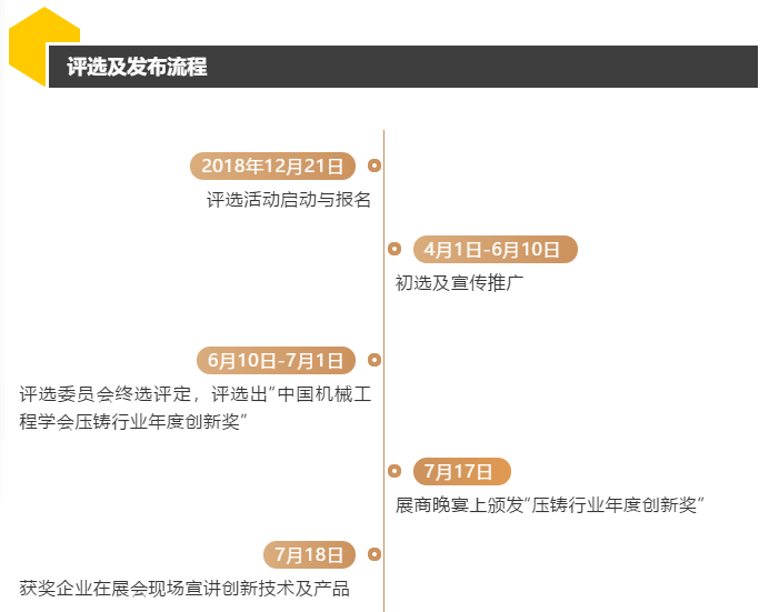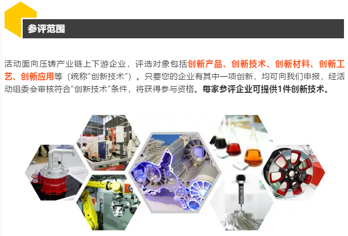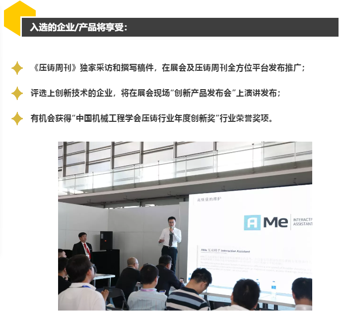 中國機械工程學會鑄造分會聯(lián)合行業(yè)知名媒體《壓鑄周刊》共同推出“2019年度壓鑄行業(yè)創(chuàng)新技術(shù)評選”活動,旨在鼓勵壓鑄企業(yè)技術(shù)創(chuàng)新、掌握核心技術(shù),在全行業(yè)內(nèi)形成創(chuàng)新風尚,提升企業(yè)競爭力,推動行業(yè)技術(shù)進步!現(xiàn)活動已全面啟動,誠邀壓鑄產(chǎn)業(yè)鏈上下游相關(guān)企業(yè)及單位積極參與,共話創(chuàng)新! 2018年“創(chuàng)新日”活動回顧 上屆展會首次設(shè)立“技術(shù)創(chuàng)新日”活動,活動匯集整個壓鑄產(chǎn)業(yè)鏈的專家與觀眾,以“綠色、創(chuàng)新、智能”為核心的深度交流,聚焦壓鑄行業(yè)“新技術(shù)、新產(chǎn)品、新趨勢”創(chuàng)新技術(shù)與產(chǎn)品,現(xiàn)場交流。40余家壓鑄上下游企業(yè)提交申請,經(jīng)過專家系列篩選后,30余件最新產(chǎn)品、技術(shù)和設(shè)備在展會現(xiàn)場進行演講發(fā)布。活動上人潮涌動,熱議“創(chuàng)新”!