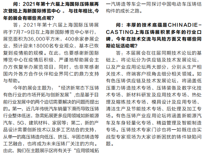 名企訪談,由中國機械工程學會鑄造分會、《壓鑄周刊》、紐倫堡會展中國聯(lián)合推出,以本屆展會之特色展商為采訪對象,報道展會期間即將推出的新產(chǎn)品、新技術(shù)及應用。