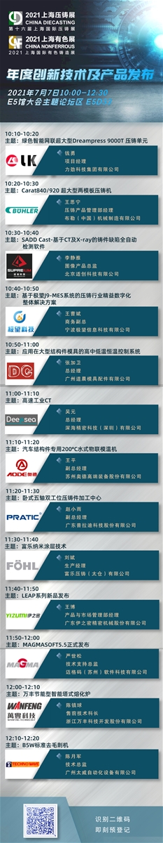 “2021年度壓鑄行業(yè)創(chuàng)新技術(shù)及產(chǎn)品發(fā)布會“,由中國機械工程學會鑄造分會(全國鑄造學會)主辦,《壓鑄周刊》、中鑄科技、紐倫堡會展中國協(xié)辦,2021年7月7日上午10:00-12:30在上海新國際博覽中心E5館舉行。