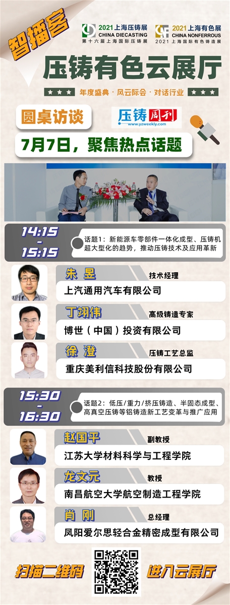 《壓鑄周刊》與主辦方合辦兩場“圓桌專家訪談”,對話6位行業(yè)專家,共同探討時下“新能源汽車大型一體化成型、壓鑄機超大型化的趨勢,推動壓鑄技術(shù)及應用革新”、“低壓/重力/擠壓鑄造、半固態(tài)成型、高真空壓鑄等鋁鑄造新工藝變革與推廣應用”兩大話題。