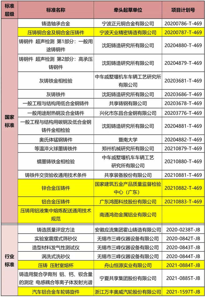 ![]() 全國鑄造標(biāo)準(zhǔn)化技術(shù)委員會(huì)近期公布了2022年鑄造行業(yè)標(biāo)準(zhǔn)制修訂計(jì)劃,其中與壓鑄相關(guān)的有6項(xiàng)(黃色標(biāo)亮)。