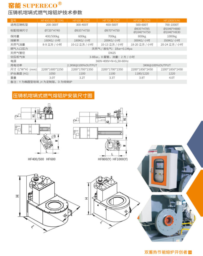 目前160-1250噸冷室鋁壓鑄機市面上坩堝熔鋁爐使用換熱燃燒方式加溫,能耗高,碳排放高,氮氧化物排放高。基于當前國家全面實行節能減排,低碳排放。我公司經過技術革新,使用全新一代獨特的HTAC燃燒方式,經過多家廠家的應用,目前技術數據上比之前的換熱燃燒節能35-50%,碳排放下降40%,氮氧化物降到80-100mg/M³