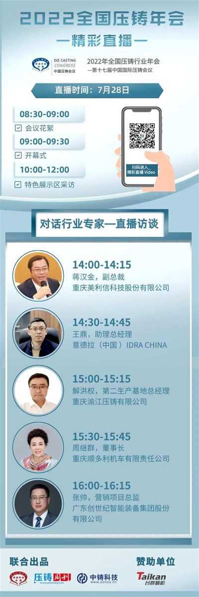 會議第一天(7月28日),主辦方將聯(lián)合《壓鑄周刊》、中鑄科技開設“專家訪談”直播間、“特色展示區(qū)現(xiàn)場采訪”,以在線直播形式對話行業(yè)專家及企業(yè)家,深度挖掘行業(yè)痛點與發(fā)展趨勢,敬請關注!