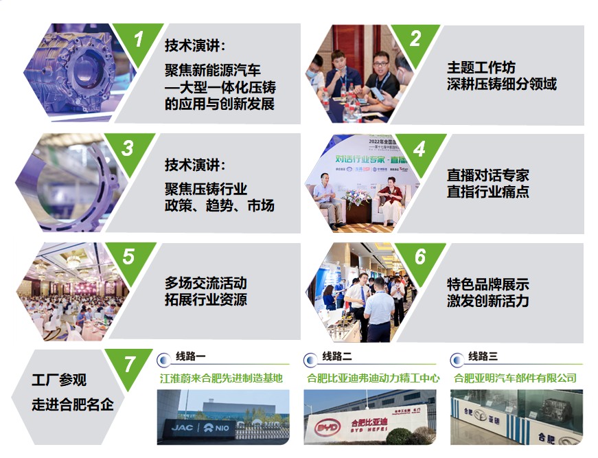 2023全國(guó)壓鑄年會(huì)將于3月22—24日在合肥香格里拉大酒店舉辦,會(huì)議以“新能源汽車(chē)制造領(lǐng)航大壓鑄時(shí)代”為主題,將邀請(qǐng)蔚來(lái)、上汽通用、長(zhǎng)安等整車(chē)廠,美利信、一汽鑄造、大連亞明等壓鑄廠,天正、精工模具等模具廠,清華大學(xué)、上海交通大學(xué)、北京理工大學(xué)等高校及科研院所及中鑄科技、中國(guó)質(zhì)量認(rèn)證中心等,共同探討壓鑄產(chǎn)業(yè)鏈解決方案及發(fā)展方向,助力新能源汽車(chē)產(chǎn)業(yè)高質(zhì)量發(fā)展,誠(chéng)邀各位壓鑄同仁蒞臨! 會(huì)議亮點(diǎn)