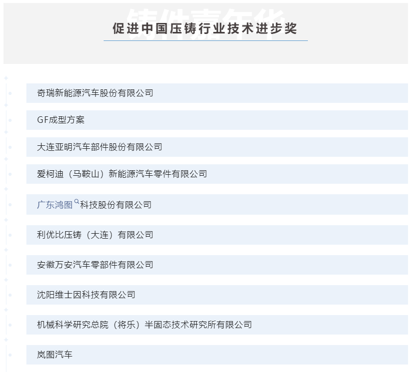 促進(jìn)中國(guó)壓鑄行業(yè)技術(shù)進(jìn)步獎(jiǎng)