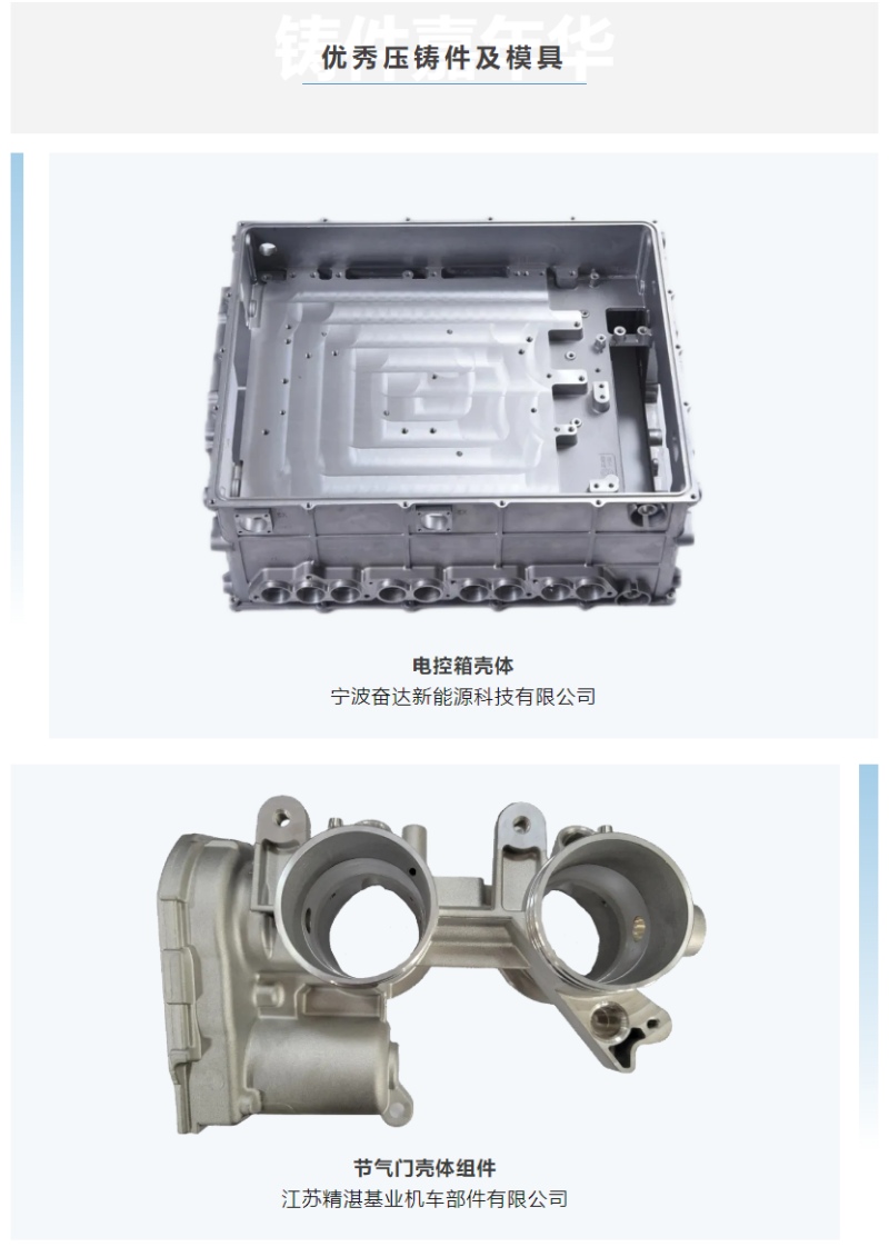 2024優(yōu)質(zhì)壓鑄件評(píng)選 作為每屆鑄件嘉年華的重頭戲,“優(yōu)質(zhì)壓鑄件評(píng)選活動(dòng)”是業(yè)界廣為關(guān)注、廣泛參與的評(píng)選活動(dòng)。旨在表彰和推廣在鑄件設(shè)計(jì)、生產(chǎn)、質(zhì)量等方面表現(xiàn)突出的企業(yè)和產(chǎn)品。本屆評(píng)選共有35家企業(yè)、48個(gè)鑄件入圍現(xiàn)場(chǎng)終選環(huán)節(jié),經(jīng)過(guò)中國(guó)機(jī)械工程學(xué)會(huì)鑄造分會(huì)特聘專家組專業(yè)、嚴(yán)謹(jǐn)?shù)默F(xiàn)場(chǎng)評(píng)審,最終評(píng)選出具有代表性的金獎(jiǎng)鑄件及金獎(jiǎng)模具各6件,優(yōu)秀鑄件及優(yōu)秀模具各12件。這些獲獎(jiǎng)鑄件及模具在材料選擇、工藝設(shè)計(jì)、產(chǎn)品質(zhì)量等方面均表現(xiàn)出色,為行業(yè)樹立了標(biāo)桿和典范。鑄件評(píng)選活動(dòng)與鑄造行業(yè)的展覽會(huì)等活動(dòng)相結(jié)合,為行業(yè)內(nèi)的企業(yè)和產(chǎn)品提供一個(gè)展示和交流的平臺(tái)。通過(guò)評(píng)選活動(dòng),可以鼓勵(lì)企業(yè)加強(qiáng)技術(shù)創(chuàng)新、提升產(chǎn)品質(zhì)量、推動(dòng)行業(yè)進(jìn)步。同時(shí),評(píng)選結(jié)果也能為行業(yè)內(nèi)外提供一份權(quán)威的參考,引導(dǎo)市場(chǎng)消費(fèi)和投資方向。 本屆展會(huì)緊跟新能源汽車發(fā)展趨勢(shì),精心打造“新能源汽車精品鑄件展示區(qū)”與“新能源街區(qū)”,匯聚多家著名主機(jī)廠與壓鑄廠,集中展示其先進(jìn)的壓鑄技術(shù)。 活動(dòng)主辦單位在7月10日晚舉辦的2024上海國(guó)際壓鑄有色展-“盛典之約”頒獎(jiǎng)典禮暨菁英晚宴期間舉辦了“優(yōu)質(zhì)壓鑄件評(píng)選”、“促進(jìn)中國(guó)壓鑄行業(yè)技術(shù)進(jìn)步獎(jiǎng)”頒獎(jiǎng)典禮,業(yè)界領(lǐng)導(dǎo)和專家為獲獎(jiǎng)單位頒發(fā)獎(jiǎng)杯與證書予以表彰。