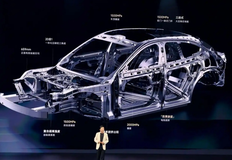 圖源:來賓市工業園區 安徽中鼎減震是安徽中鼎控股(集團)股份有限公司(簡稱“中鼎集團”)旗下子公司,成立于2005年5月,是汽車與鐵路工業減震橡膠金屬件領域的專業供應商。中鼎集團是以機械基礎件和汽車零部件為主導產業的跨國民營企業集團,業務范圍涵蓋機械基礎件、汽車零部件、液壓氣動密封件、機械電子、精密模具、汽車工具等多個領域。 小米YU7搭載一體化壓鑄鋁三角梁、大壓鑄后地板 5月22日,在小米15周年戰略新品發布會上,小米集團創始人、董事長兼CEO雷軍介紹了其首款豪華SUV小米YU7車型的安全信息。