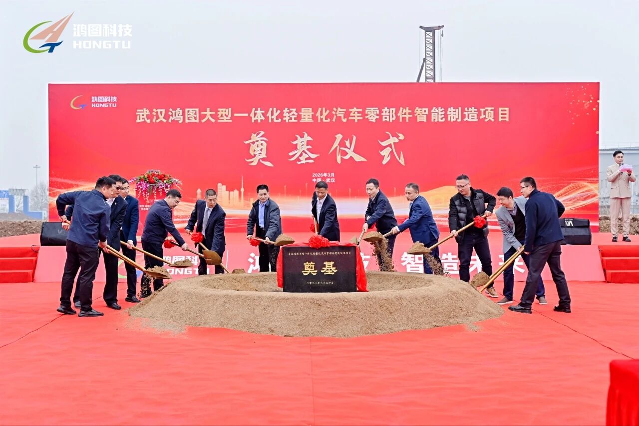 富維股份于2025年3月,經董事會戰(zhàn)略決策進軍鎂合金領域。同年7月,全國首條數(shù)字化半固態(tài)成型產線落地,具備以850T注射島為核心的制造加工能力。2026年3月,3600t鎂合金半固態(tài)注射成型機組調試完成,可實現(xiàn)0.3kg-10kg產品全覆蓋。依托全數(shù)字化驅動產線,實現(xiàn)了從漿料制備到成型工藝的全流程智能管控。 此外,富維股份協(xié)同中國一汽研發(fā)總院、富維股份創(chuàng)新研發(fā)院、富維安道拓等單位,聯(lián)合開發(fā)鎂合金座椅骨架、扶手骨架、儀表板支架等多款產品。全國首套半固態(tài)成型工藝鎂合金座椅骨架核心部件已完成總成裝配,進入主機廠臺架驗證階段。該產品將19個鋼結構零件集成為4個鎂合金零件,替代部分降重達26%。 廣東鴻圖(武漢)大型一體化壓鑄汽車部件智造項目奠基動工 3月20日,廣東鴻圖科技股份有限公司(簡稱“廣東鴻圖”)投資建設的廣東鴻圖(武漢)大型一體化輕量化汽車零部件智能制造項目(簡稱:廣東鴻圖武漢二期項目)奠基儀式,在湖北省武漢市江夏區(qū)金港新區(qū)舉行。