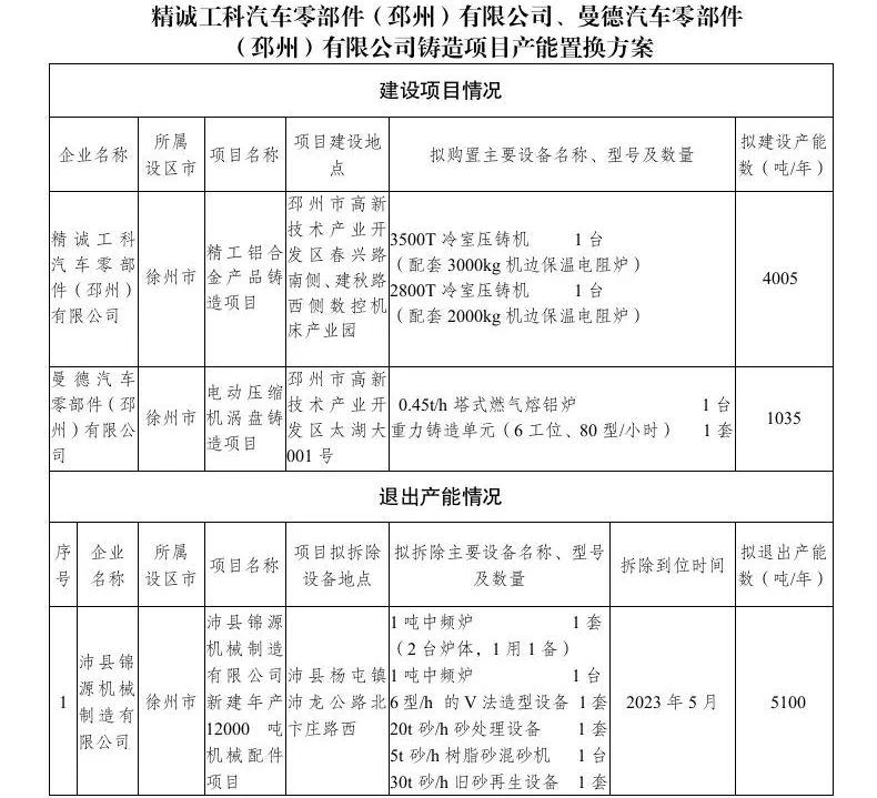 公告顯示,精誠工科汽江車零部件(邳州)有限公司擬在江蘇省邳州市高新技術產業開發區,建設精工鋁合金產品鑄造項目,擬購置3500T冷室壓鑄機一臺,配套3000KG機邊保溫電阻爐,2800T冷室壓鑄機一臺,配套2000KG機邊保溫電阻爐。 曼德汽車零部件(邳州)有限公司擬在邳州市高新技術產業開發區,建設電動壓縮機渦盤鑄造項目,擬購置重力鑄造單元1套,0.45t/h塔式燃氣熔鋁爐1臺。此次退出產能企業沛縣錦源機械制造有限公司,擬退出年5100噸鑄造產能。