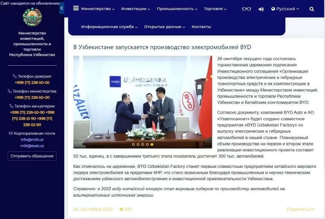 據介紹,該項目由無錫貝斯特精機股份有限公司投資建設,規劃用地約240畝,分兩期建設。項目共新建廠房及配套設施約13萬平方米,主要從事新能源汽車零部件產品的生產和銷售。一期新建廠房及配套設施面積約7萬平方米,新購壓鑄機、CNC加工中心等各類設備,主要從事新能源汽車鋁合金電機殼和轉向節等產品的生產和銷售。 比亞迪在烏茲別克斯坦投資汽車工廠 據媒體報道,烏茲別克斯坦投資、工業和貿易部網站發布聲明,宣布2023年9月26日與比亞迪簽署《在烏茲別克斯坦生產電動和混合動力汽車及其零部件投資協議》。