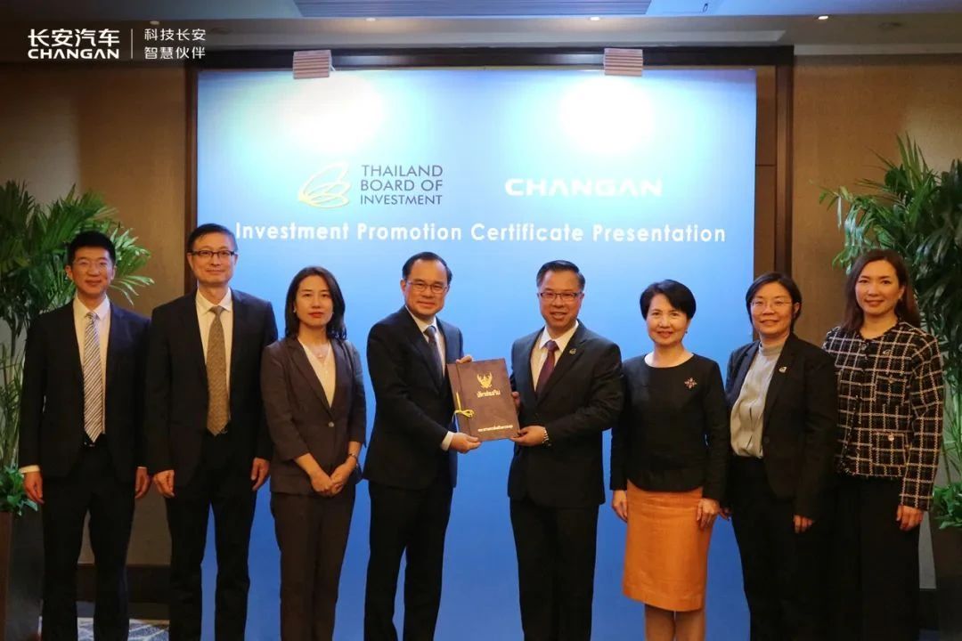 10月17日,在北京舉行的第三屆“一帶一路”企業家大會上,重慶長安汽車股份有限公司(簡稱:長安汽車)與泰國投資促進委員會現場簽約,計劃在泰國投資88億泰銖(約合17.7億元人民幣),建設新能源汽車生產工廠。當天,泰國投資促進委員會秘書長納立·特薩提拉沙向長安汽車董事長朱華榮頒發了長安汽車泰國生產基地項目投資證書。