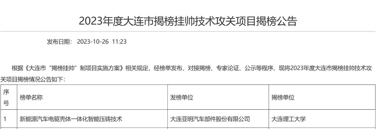10月26日,大連市科技局發(fā)布了2023年度大連市揭榜掛帥技術攻關項目揭榜公告。大連亞明汽車部件股份有限公司的“新能源汽車電驅殼體一體化智能壓鑄技術”獲得2023年度大連市揭榜掛帥技術攻關項目立項。