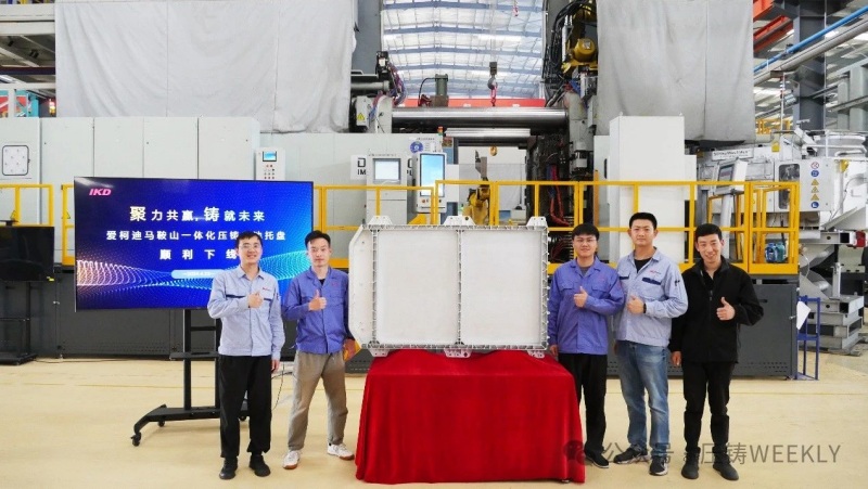 ![]() 思進智能推出擠壓、高壓鑄造兩用壓鑄機 近日,思進智能成形裝備股份有限公司(簡稱:思進智能)在“2024寧波國際鑄造及壓鑄展”上推出了兼具擠壓鑄造和高壓壓鑄功能的兩用壓鑄機。據悉,這款新型設備相當于擠壓鑄造機和普通壓鑄機的融合體,它具備了擠壓鑄造和高壓壓鑄兩種功能,并且在使用時可以輕松切換。 據思進智能壓鑄機事業部銷售總監劉琪昌介紹,這款擠型和壓鑄兩用壓鑄機,配備了三缸射料系統,提供七種壓射工藝供用戶選擇,真正實現了一機兩用的設計理念。當采用擠壓鑄造工藝時,它能在慢速高壓的條件下生產無砂孔厚壁件;而切換到普通高壓壓鑄工藝時,則能在高速高壓的條件下生產薄壁件,甚至還可以用于純鋁壓鑄。此外,通過這款壓鑄機生產的壓鑄件產品,可進行T6熱處理、陽極氧化、電鍍等后續處理。 值得一提的是,擠型和壓鑄兩用壓鑄機,與普通壓鑄機一樣,只需常規的壓鑄環境以及常規的機械手、模具,即可實現高效生產。 一體化壓鑄汽車電池托盤在愛柯迪馬鞍山工廠下線 近日,某國際領先新能源車企一體化壓鑄電池托盤在愛柯迪馬鞍山工廠成功下線。據悉,該托盤采用高強韌免熱處理材料,產品一體鑄造成型,性能更優,成本更低。