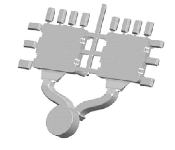 圖3 帶有澆排系統(tǒng)的散熱片示意圖 首先在Flow-3D軟件中對壓鑄工藝參數(shù)進行設置,澆注溫度為680℃,模具預熱溫度為200℃,充型速度為20m/s。將初始工藝設計的實體三維模型轉化為STL格式導入Flow-3D軟件進行網(wǎng)格劃分。