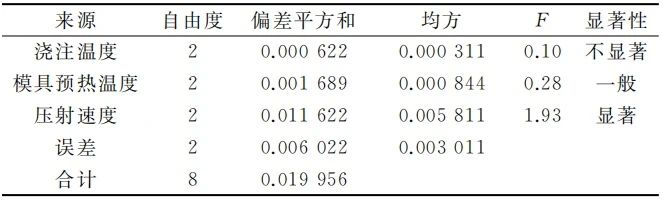 表6 方差分析表 在僅考慮縮孔率的情況下,可知,A>B>C,即壓鑄工藝參數對縮孔率的影響程度由大到小依次為:澆注溫度、模具預熱溫度、壓射速度。在僅考慮縮孔率的情況下,滿足信噪S/N2最大的壓鑄工藝參數組合為A1B2C1,即澆注溫度為660℃、模具預熱溫度為180 ℃、壓射速度為4.5m/s。