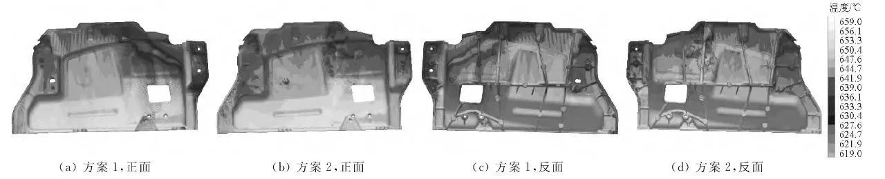 圖3 2種方案充型速度模擬結果 可以看出,方案1的溫度分布很不均勻,靠近鑄件中間區域有很大面積的溫度較低,不超過630℃,而其他區域的溫度都達到645℃以上,形成了較大的溫度差,使得該區域在凝固過程中的速度不一致,有明顯的凝固時間差,導致后凝固的區域得不到金屬液補縮。易出現嚴重的縮孔缺陷。方案2的溫度分布較為均勻,鑄件的主體位置溫差不超過3℃。就填充溫度來看,方案2優于方案1。當填充至40%時,方案1中A位置的填充速度過快,達到50m/s以上,使得速度較快的金屬液會優先填充鑄件,導致鑄件填充不均勻。當填充至73%時,因為A區域的金屬液填充過快,使得在與速度較慢的金屬液混合時會形成未填充的空白區域,見圖3c中B區域。該區域由于被兩股金屬液包圍而后才慢慢被填充,導致該區域容易出現憋氣現象。當填充至90%時,出現了大片容易憋氣的區域,見圖3e中C區域。相較于方案1,方案2的充型速度模擬效果更好。