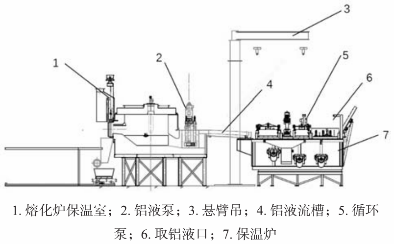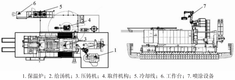 圖4 壓鑄島工藝布局。 2周邊關鍵設備設計 2.1 熔煉系統 大型一體化壓鑄帶澆注系統質量約為82 kg,按90 s節拍計算,每小時鋁液消耗量為3.28 t,為了保證產能的穩定性,選擇4 t/h熔化能力的熔化爐。為了保證保溫爐溫度的穩定性,選擇10 t保溫爐。如圖5所示,鋁液熔化后,通過鋁液泵將鋁液運輸到保溫爐中,保溫爐下方也通過透氣磚通入氬氣,讓鋁液中的氫氣溢出,同時保溫爐也設計循環泵,保證鋁液的密度指數小于2%。同時也避免了傳統保溫爐通過叉車轉運鋁液,大大降低了勞動強度,提升了效率。