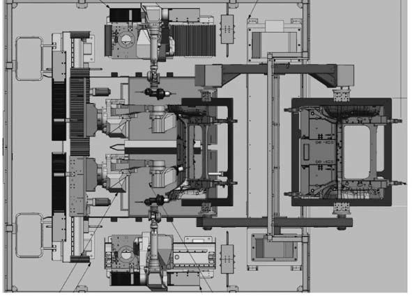 圖13 去毛刺站簡圖 2.7 探傷檢測站 探傷主要檢測鑄件內部的氣孔和縮孔等缺陷,一般以離線檢測為主,由于一體化壓鑄件產品尺寸大,采用離線檢測的方式耗時,從壓鑄島搬運到實驗需要10 min,再將壓鑄件放入探傷設備檢驗反饋結果,不僅搬運勞動強度大,耗時多,還結果反饋慢。在開發初期就將探傷機放在壓鑄島內,可以實現快速探傷檢測。 同時由于信息傳遞延遲,浪費時間。為了解決這些問題,將X-RAY探傷設備集成在壓鑄島中,不僅減少了產品的搬運,還可以快速反映鑄件品質的狀態。同時也可以根據增加抽檢的頻率。減少不良損失。圖14為X-RAY探傷設備的外形圖。產品放在檢測支架小車上,下方有四個滾輪,由于小車下面的軌道和探傷房內部的軌道不連續,四個滾輪完美解決這個問題。小車進入鉛房內,關閉安全門,開始進行探傷檢測。