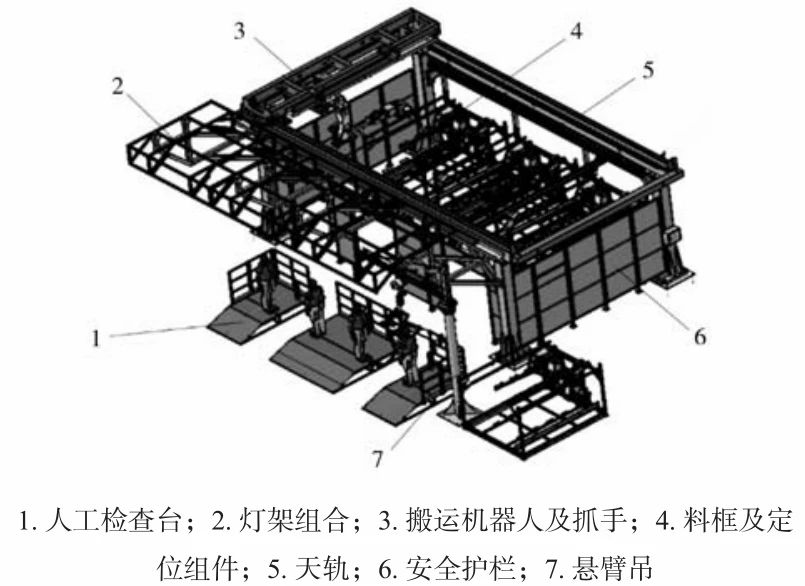 圖14 探傷設備外形圖 2.8 自動化裝箱 圖15為產品在AGV上的示意圖。通過機器人將產品放在AGV小車上,小車識別到有產品后,搬運產品到人工檢查工位(圖16);人工對產品外觀進行100%檢查,檢查后輸入合格和不合格信息,信息傳遞到自動化裝箱站。機器人根據產品信息將產品放入合格品或不合格品的料架,實現了自動裝箱。當裝箱站的料架裝滿產品后,自動化裝箱站呼叫新的AGV進入自動化裝箱站,更換新的料架。整個過程自動化完成,減少人工搬運,提高效率。