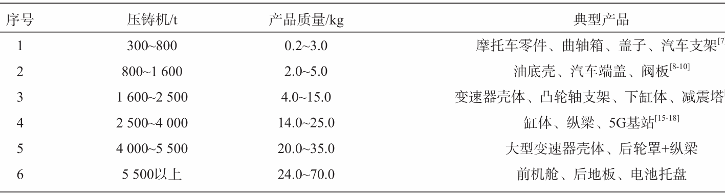 圖1 傳統壓鑄島工藝布局簡圖 隨著免熱處理材料的開發,壓鑄零部件不斷向高集成化發展,零部件尺寸和質量也在不斷增加,同時壓鑄機的噸位也隨之增加。通過調研,從表1壓鑄機與產品發展趨勢來看,壓鑄機的噸位越大,產品質量越大。近年來,大型一體化壓鑄零件在汽車領域的應用越來越多,且集中在4 000 t以上,產品越來越大,質量也隨之增加,人工搬運產品變得效率低下,且勞動強度越來越大,產品的渣包料餅去除,產品檢測過程中搬運效率提升必須走自動化路線。本文結合自身壓鑄島周邊設計與實踐經驗,從產品工藝流程,壓鑄島周邊布局,熔化爐自動化投料,噴涂工裝設計原理,快速水冷站設計,渣包去除控制要點及工裝設計,等離子去料餅方案,自動化去毛刺,在線X-Ray探傷檢測,自動化裝箱和HSE等方面做了逐一說明。