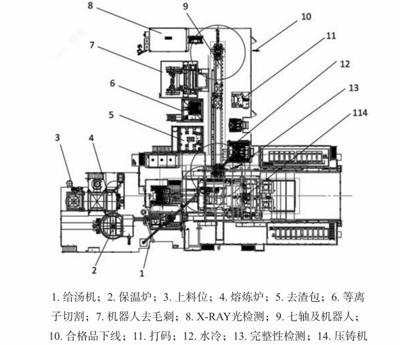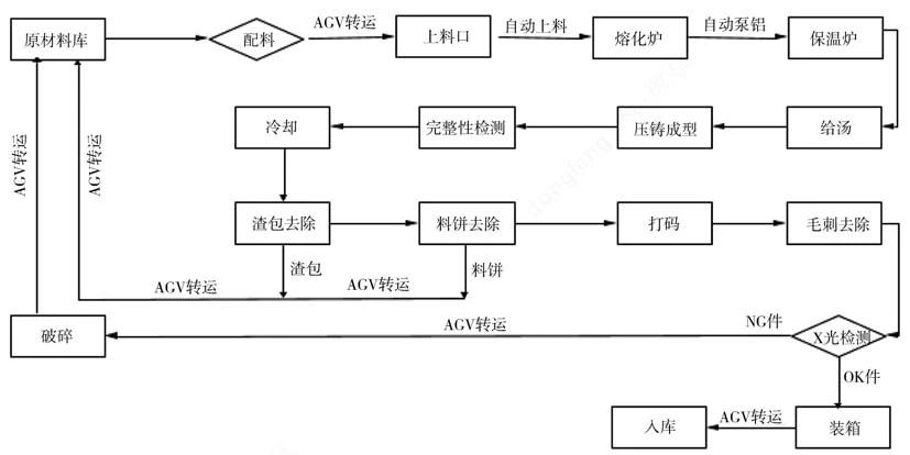 圖3 壓鑄工藝流程 1.2 壓鑄島周邊自動化布局 根據圖3的工藝流程,把所有的加工都盡可能放在壓鑄島內。如圖4壓鑄島工藝布局所示,物料的流動如下:鋁液熔化后,通過鋁液泵將熔化爐中鋁液搬運到保溫爐中;保溫爐中的鋁液通過給湯機搬運到壓室,通過壓鑄機壓射,鋁液充填到模具成為帶澆注系統的產品;當凝固冷卻后,取件機器人取件,放入冷卻工位冷卻;冷卻后,搬運機器人將產品放入去渣包工位,去除渣包;機器人取件放入去料餅工位(等離子切割),去除料餅后,搬運機器人將產品放入打碼工位,給產品刻印明碼及二維碼;隨后搬運產品進入去毛刺工位,去毛刺完成后,根據品質檢測需要進入X-RAY抽檢,完成后通過成品下線AGV運輸;通過人工工位全檢后,AGV運輸產品到裝箱站,裝箱站機器人根據產品的品質信息,進行分類裝箱;當裝箱完成后,AGV機器人將裝箱好的料架搬運到對應的區域入庫。