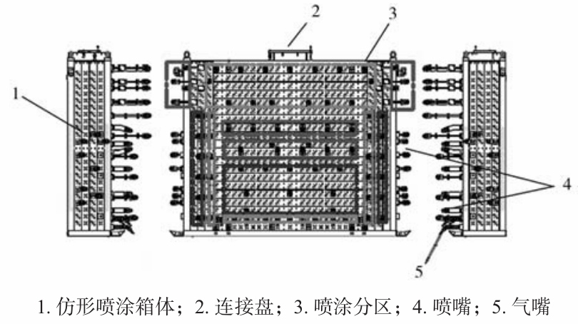 圖6 AGV投料小車示意圖 2.2 噴涂系統 為了縮短噴涂時間,大型一體壓鑄噴涂必須采用仿形噴涂。如圖7所示,仿形噴涂采用多回路方式,對模具上需要噴涂的位置進行分區控制,這樣有利于根據產品的實際需求,設定不同噴涂量及噴涂時間,在保證脫模效果的同時,還能進一步減少噴涂時間。