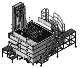 圖7 仿形噴涂簡圖 同時,配比機采用多個脫模劑混合箱,可以實現不同濃度配比,結合工裝的多回路控制,不僅實現了分區時間控制,也實現了分區濃度控制,特別有利于深腔的位置;結合大型壓鑄機的開模距離比較大,6 000 t以上壓鑄機開模距離在2 000 mm以上,這樣就有足夠的空間在動定模設計噴涂,可以實現動定模同時噴涂,大幅縮短了噴涂時間。 2.3 冷卻裝置 由于產品質量較大,采用傳統的風冷方式,需要更多的時間且占用空間大,因此,大型一體壓鑄零件冷卻必須采用水冷,這樣效率更高。可以在30 s以內將產品的溫度降低在70 ℃以下,為后工序的產品尺寸穩定性提供了保障。水箱的材質采用304不銹鋼,可以避免后續使用時生銹。水溫控制在50 ℃左右。如圖8所示,水冷工裝采用浮球加緊工裝,借助水的浮力,在升降過程中,零件定位更穩定,速度更快,生產效率更高。