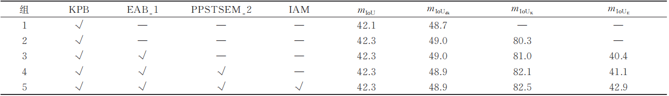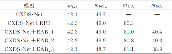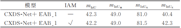 本試驗采用 CXDS-Net+ EAB_1 模型作為基準網(wǎng)絡(luò)。由試驗結(jié)果可知,提出的 3 種 PPSTSEM 均可以有效地提高模型在關(guān)鍵位置分割任務(wù)上的分割精度,其中PPSTSEM_2 在mIoUK和mIoUE 指標上均達到最佳。 為了進一步在保證缺陷分割精度的同時提高關(guān)鍵位置處的分割精度,提出了一種交互式注意力模塊,在關(guān)鍵位置解碼階段,通過對關(guān)鍵位置解碼特征和關(guān)鍵位置邊界解碼特征分別通過注意力機制模塊進行互補融合來提高各自任務(wù)的分割精度。本試驗以 CXDSNet+EAB_1 模型為基準網(wǎng)絡(luò),對 IAM 模型的有效性進行驗 證 ,結(jié)果見表3??梢钥闯?,在解碼階段引入IAM后,通過對關(guān)鍵位置特征及其邊界特征進行互補融合后,模型在mIoUK和mIoUE指標上均有所提升,從而驗證了提出 IAM 對關(guān)鍵位置分割任務(wù)的有效性。進一步對驗證將各個模塊集成到基準網(wǎng)絡(luò)后模型的有效性,試驗結(jié)果見表4。由試驗結(jié)果可知,提出的多任務(wù)缺陷分割模型可以同時提高在缺陷分割和關(guān)鍵位置分割這兩個具有低相關(guān)性任務(wù)的分割精度,可以很好地滿足在實際質(zhì)檢過程中同時對缺陷區(qū)域和關(guān)鍵位置區(qū)域分割的需求。 表3 基準模型在采用交互式注意力模塊的結(jié)果