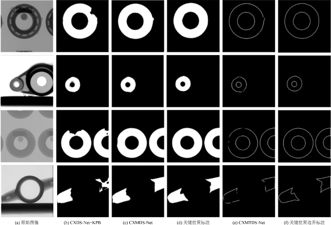 圖9為CXDS-Net+KPB和提出的多任務(wù)分割模型CXMTDS-Net對關(guān)鍵位置及其邊界的分割結(jié)果示例。從分割結(jié)果可知,CXMTDS-Net模型相比于CXDS-Net+KPB對關(guān)鍵位置的分割性能有顯著提升,CXDS-Net+KPB僅在具有顯著邊界的關(guān)鍵位置的分割效果較好,而在邊界模糊的區(qū)域的分割精度需要進一步改進,而CXMTDS-Net在對關(guān)鍵位置邊界不明顯的區(qū)域具有更好的分割精度,見圖10,可見提出的模型可以實現(xiàn)對缺陷區(qū)域的精準分割。