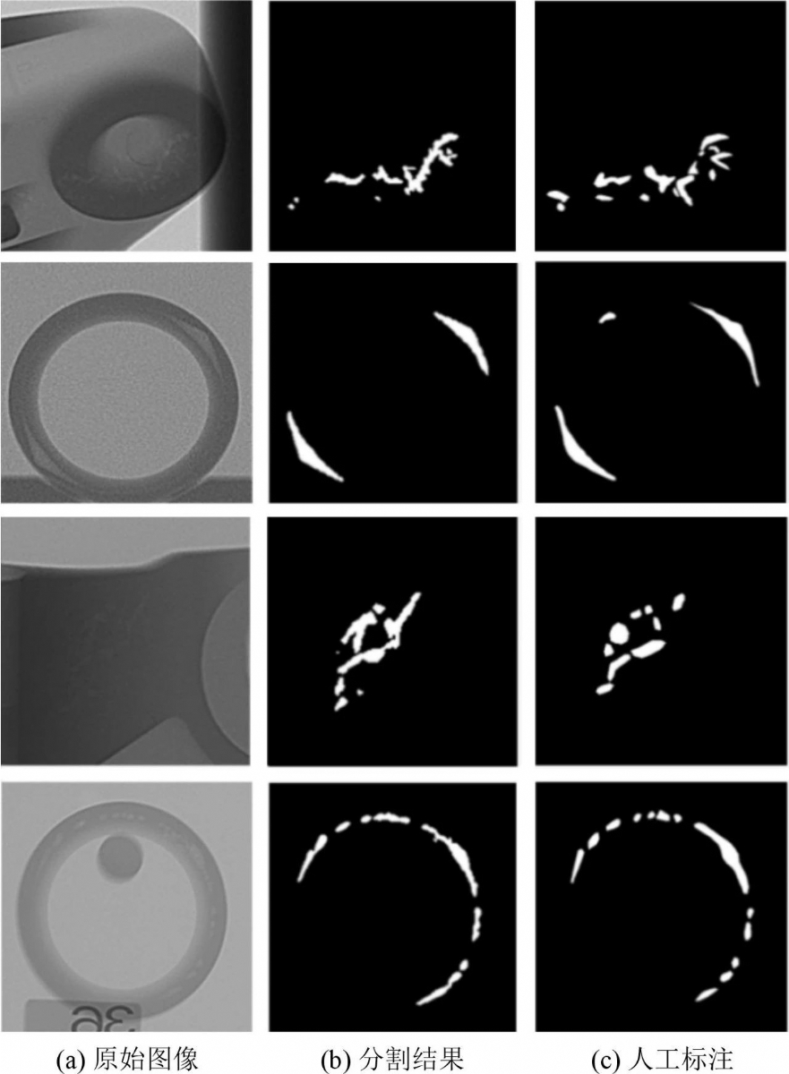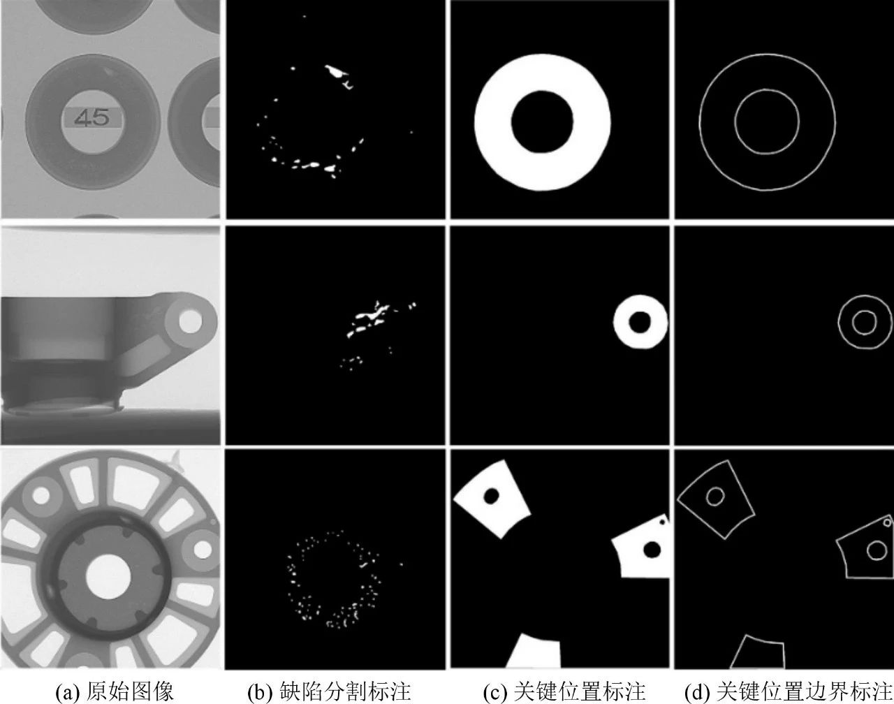 圖7 交互式感知模塊 構(gòu)建了汽車鋁合金壓鑄件X射線圖像的數(shù)據(jù)集,在實際的汽車零部件檢測過程中,檢測人員將待檢測的零件放置到X射線圖像檢測系統(tǒng)中。X射線檢測系統(tǒng)由4部分組成:X射線發(fā)射源、機械傳動系統(tǒng)、數(shù)字平板探測器和計算機圖像處理系統(tǒng)。 在構(gòu)建的數(shù)據(jù)集中包含3 200張X射線圖像提供了缺陷區(qū)域的人工標注結(jié)果,標注的內(nèi)容主要包括:缺陷區(qū)域像素級、鋁合金壓鑄件中的關(guān)鍵位置及其邊界像素級,見圖8,其中汽車鋁合金壓鑄件中的關(guān)鍵位置主要包括待加工的孔、端面以及與其他零件配合的表面等。在鋁合金壓鑄件中,如果缺陷出現(xiàn)在關(guān)鍵位置時,會對下一工序的加工及零件后續(xù)的使用過程中造成較大的安全隱患。在質(zhì)檢過程中,需要重點關(guān)注這類關(guān)鍵位置的缺陷分布情況。
