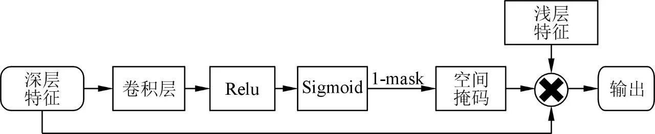 圖5 邊界感知的關(guān)鍵位置分割解碼器策略 在高相關(guān)性的多任務(wù)分割任務(wù)中,研究者廣泛采用共享編碼器的方式同時對各個任務(wù)相關(guān)的特征進行編碼,通過在多任務(wù)監(jiān)督下參數(shù)共享的編碼器可以提取互補的特征,分別提高各個任務(wù)的分割精度。對于低相關(guān)性的多任務(wù)分割編碼模型而言,在淺層編碼階段,可以從圖像中提取出鋁合金壓鑄件的結(jié)構(gòu)特征、邊界信息和壓鑄缺陷的紋理信息。在深層編碼階段會對不同的區(qū)域進行深度語義特征提取,在同一編碼模塊中并不能提高有效的互補語義信息,這種直接參數(shù)共享編碼的方法反而會降低兩個任務(wù)的分割精度。 在淺層特征提取階段通過參數(shù)共享的方式同時對壓鑄缺陷的紋理特征和關(guān)鍵位置的紋理信息以及邊界特征進行編碼。在提出的PPSTSEM中,新設(shè)計的深層編碼分支的卷積層參數(shù)與原始編碼對應(yīng)卷積層的模型參數(shù)保持一致,根據(jù)采用深層編碼層級的不同,可以將在PPSTSEM的深層編碼分支分為3種:只采用第5_1卷積層,采用第4_1、第5_1卷積層,采用第3_1、第4_1、第5_1卷積層,見圖6,在試驗環(huán)節(jié)中將對采用不同層級的深層編碼階段進行驗證。 為了進一步提高對關(guān)鍵位置分割任務(wù)的分割精度,提出了一種交互式注意力模塊(Interactive Attention Module,IAM),見圖7,通過采用與本任務(wù)具有高相關(guān)的其他任務(wù)的特征,引入注意力機制模塊獲取本任務(wù)特征的注意力圖,對提取的注意力圖取反獲得互補的注意力圖,將互補的注意力圖與來自其他任務(wù)的特征進行像素級相乘來獲取與本任務(wù)互補的特征,進一步與原始特征進行像素級的相加來得到模塊的輸出特征。