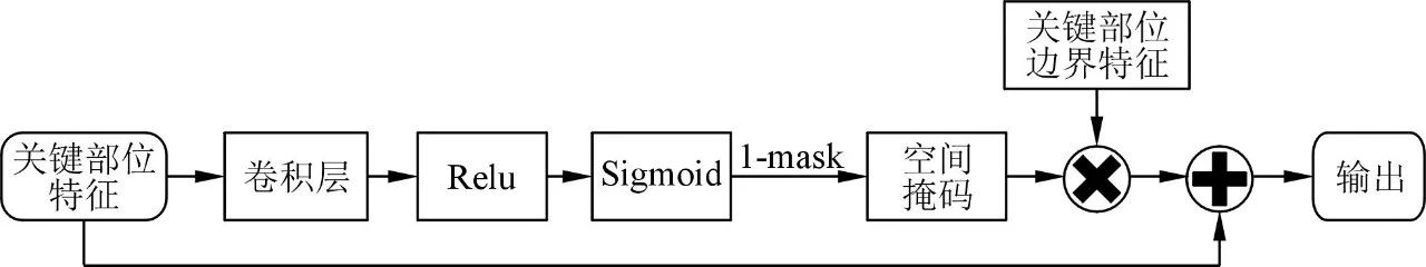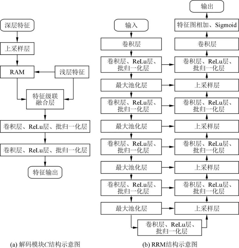 圖10 CXMTDS-Net分割結(jié)果示例 針對缺陷分割和關(guān)鍵位置分割任務(wù)提出了多任務(wù)分割模型CXMTDS-Net,可以有效提升關(guān)鍵位置分割精度。為了提升顯著性目標的分割精度,F(xiàn)AN D P等提出了一種反向注意力模塊(Reverse Attention Module,RAM),見圖11。通過該模塊可以挖掘分割區(qū)域與其邊界之間的內(nèi)在聯(lián)系,從而提高模型對目標區(qū)域的分割精度。QIN X B等提出了一種殘差細化模塊(Residual Refinement Module,RRM),設(shè)計了一種編碼和解碼的結(jié)構(gòu)對模型預測的結(jié)果進行修正,從而提高模型在邊界區(qū)域的分割精度。以CXDS-Net +EAB_2+ PPSTSEM_2為基準網(wǎng)絡(luò)分別將RAM和RRM方法與基準網(wǎng)絡(luò)融合與所提出的CXMTDS-Net模型進行定量對比,從而驗證提出的方法對提高關(guān)鍵位置分割精度的有效性,見圖12。