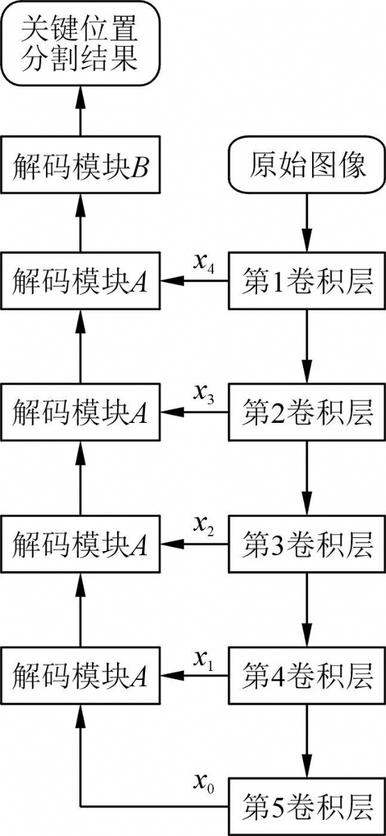 圖3 鋁合金壓鑄件X射線圖像缺陷分割模型 由于壓鑄缺陷分割任務(wù)和鑄件關(guān)鍵位置分割任務(wù)之間的低相關(guān)性,直接在缺陷分割解碼器中引入關(guān)鍵位置分割解碼器并不能滿足分割需求。因此,設(shè)計了針對壓鑄件關(guān)鍵位置分割任務(wù)的解碼器(Key Parts Branch,KPB),見圖2。關(guān)鍵位置在X射線圖像中較為明顯,在解碼器中直接采用經(jīng)過原始圖像編碼后提取的特征即可獲取充足的關(guān)鍵位置處的紋理特征和深層語義特征。在本研究中,將原始圖像編碼的各層級輸出的特征圖分別用x0~x4來表示,關(guān)鍵位置分割解碼器中的解碼模塊A和B的具體結(jié)構(gòu)見圖4。雖然鋁合金壓鑄件中的關(guān)鍵位置在X射線圖像中的特征較為明顯,但是關(guān)鍵位置的外形和位置多樣,且在關(guān)鍵位置的部分邊界存在不連貫處,直接采用關(guān)鍵位置解碼器進行分割時,部分分割結(jié)果會在邊界處的分割精度較低。提出邊界感知解碼器來對關(guān)鍵位置的邊界進行分割,見圖5,根據(jù)編碼層級的不同,分別設(shè)計了3種邊界感知模塊(Edge-Aware Branch,EAB),在EAB_1中,利用編碼模塊中的淺層特征—x4特征圖像,同時進行對關(guān)鍵位置分割及其邊界進行分割。在EAB_2中,設(shè)計了3個解碼模塊分別利用編碼模塊中的x2、x3、x4特征圖同時進行語義分割和邊界分割。在EAB_3中,設(shè)計了和KPB一致的解碼器結(jié)構(gòu),充分利用了不同階段的編碼器的特征。在后續(xù)的試驗中,將對設(shè)計基于不同融合階段的EAB模型進行定量評價。