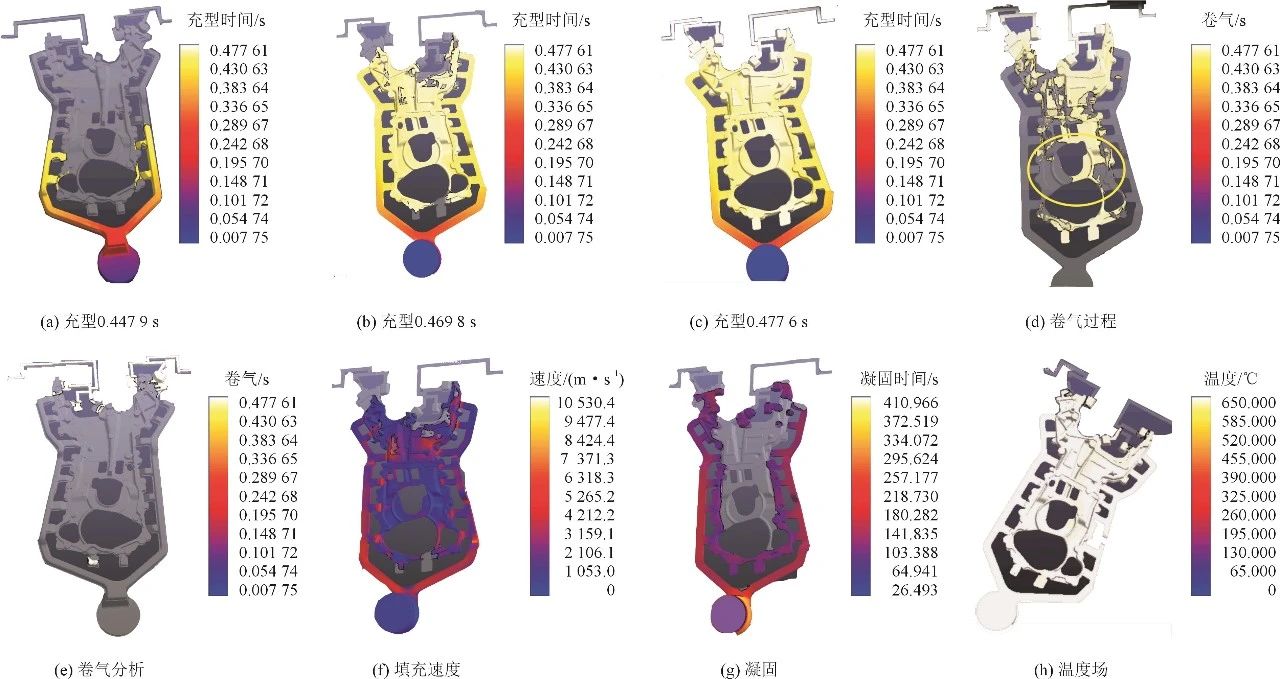 圖5 橫向單側(cè)填充數(shù)值模擬 根據(jù)對正時鏈蓋橫向澆注系統(tǒng)數(shù)值模擬的分析,該澆注系統(tǒng)在填充和凝固過程中會產(chǎn)生鑄造缺陷的風(fēng)險很大,而且會降低模具使用壽命,此澆注系統(tǒng)不適合正時鏈蓋的壓鑄。 正時鏈蓋按圖4縱向雙側(cè)填充澆注系統(tǒng)進(jìn)行模擬分析,結(jié)果見圖6。可以看出,①填充過程實現(xiàn)鑄件循序填充,在填充0.447 9 s開始進(jìn)行高速切換,0.477 6 s充型結(jié)束,鑄件充型時間為0.029 7 s,能夠?qū)崿F(xiàn)薄壁鑄件的快速填充;同時采用雙向填充,內(nèi)澆口從兩側(cè)面厚壁處進(jìn)入型腔,有利于壓射壓力的傳遞。②對填充過程卷氣分析,下側(cè)的分支澆道對應(yīng)鑄件內(nèi)部空腔,金屬液進(jìn)入型腔后沖擊型腔壁,造成局部的紊流和卷氣,見圖6d;填充末端上側(cè)卷氣部位合理布置溢流和排氣槽,能夠輔助末端氣體的排出;下側(cè)卷氣部位無法設(shè)置排氣道。③充型過程中內(nèi)澆口的速度較穩(wěn)定,瞬間速度小于60 m/s,適合于鋁合金薄壁件的填充。④凝固過程中間薄壁區(qū)先凝固,兩側(cè)厚壁區(qū)后凝固,在凝固過程中兩側(cè)厚壁處通過內(nèi)澆口增壓補(bǔ)縮,不存在孤立的液相區(qū)域,沒有產(chǎn)生縮孔的風(fēng)險。