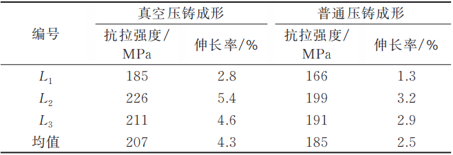 圖4 L1散熱片表面缺陷 采用L1~L3工藝參數分別制取普通壓鑄件與真空壓鑄件若干。分別對3組試驗制取的普通壓鑄件和真空壓鑄件進行取樣,取樣位置分為散熱片第2片和底板兩部分,見圖2。采用電火花線切割機制取金相晶相試樣和拉伸試樣,用JHY-5000電子萬能實驗機對散熱片進行力學性能測試。可以看出,L1散熱片上存在尺寸較大的縮孔和分布范圍較廣的縮松;L2散熱片上的縮松范圍較小,尺寸較小;L3散熱片存在尺寸較大的縮孔和縮松。L1底板存在尺寸較小的縮孔但分布范圍廣;L2底板存在少量縮松和尺寸較小的縮孔;L3底板存在多處縮松和縮孔。分析認為,采用自主設計的真空抽氣系統能夠把模具型腔的大部分氣體抽出,因而制得的真空壓鑄件內部氣孔有所減少,但由于快壓射速度不同導致抽真空時間不同,模具型腔的最終氣壓也不同,型腔里金屬的流動狀態也有差異,所以3組試驗制得的真空壓鑄件其縮松、縮孔也有差別。 表3 散熱片力學性能