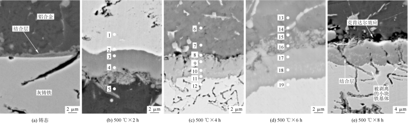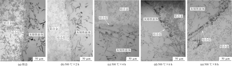 圖1 Fe-Al雙金屬復合試樣及剪切測試夾具 圖2為不同熱處理時間下的雙金屬復合界面金相組織。從圖2a可見,鑄態下HT250灰鑄鐵金相組織由片狀石墨及鐵基體組成,片狀石墨呈無方向性均勻分布,A380主要組織為α-Al及纖維狀共晶Si及少量片狀初生Si組成,纖維狀共晶Si嵌入在α-Al基體中。灰鑄鐵嵌體表面經過電鍍鋅處理后,兩金屬之間在界面處形成連續的結合層并實現冶金結合。經過500 ℃保溫2 h熱處理隨爐冷卻后(見圖2b),固相嵌體HT250的金相組織與原始組織相比無明顯變化,而A380鋁合金中Si相經過重熔,未觀察到原本存在于鑄態A380中少量的片狀初生Si,原纖維狀細小的共晶Si轉變為大小不均的短棒狀、顆粒狀散布于α-Al基體中。在復合界面處,界面仍然呈現完好的冶金結合形態,在OM下觀察到的形貌與未經過熱處理的復合鑄件界面處形貌無明顯差異。 圖3為不同熱處理時間下的雙金屬復合界面SEM圖。圖4為雙金屬界面結合層厚度與熱處理時間的關系。可以看出,在熱處理溫度一定的情況下,隨著擴散時間延長,雙金屬界面結合層厚度不斷增加。
