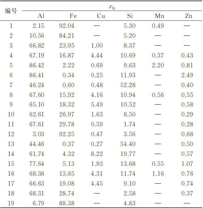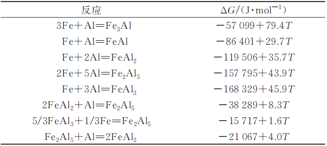 所研究的Fe-Al雙金屬之間可能存在的生成物較為復雜,較難直接判斷各種不同反應的發生與否及先后順序,而借助吉布斯自由能(Gibbs free energy)能夠判斷熱力學反應的方向。以自由能最小原理作為基本判定依據,即在溫度與壓強一定的情況下,系統內反應總是朝著能使其自由能降低的方向進行,所以雙金屬界面金屬間化合物反應能否自發進行的判據為:ΔG≤0。結合試驗結果與前述可能在反應中生成的化合物分析,在熱處理試驗中可能存的反應及其對應的吉布斯自由能變見表4(溫度為20~660 ℃)。經過計算吉布斯自由能變得到,在熱處理條件(500 ℃)下,最容易生成的物相,即吉布斯自由能變最小的物相為FeAl3(-132 841.42 J/mol),其次為Fe2Al5(-123 853.72 J/mol)。 表4 Fe-Al雙金屬體系可能發生的反應及其對應的吉布斯自由能變化