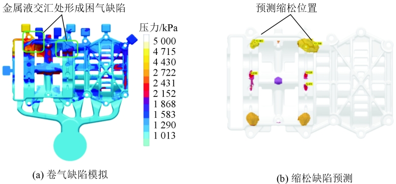 圖2 連接支架壓鑄澆注系統和排溢系統初始設計 針對連接支架零件的結構特點和質量要求,采用Magma®軟件對支架壓鑄充型過程的溫度變化、充型速度、氣壓變化和縮松缺陷預測等進行模擬。圖3為鋁液充型的各階段模擬。通過模擬對比可以看出,支架鑄件在凝固過程中各個工藝區域的充型速度和冷卻凝固順序存在著不均衡現象。從圖3a可以看出,鋁液初始填充階段,采用多個垂直式內澆口同時充型,使鋁液與模具間的熱傳導速度呈現不同步,溫度變化速度出現一定差異現象。其次,由于零件各區域的壁厚和形狀差異造成了填充型腔的金屬液體積及充型速度差別較大,充型完成時間不同步, C區域基本充滿時,A、B區域部分位置還有接近20%的型腔未充滿。從圖3c和圖3d可以看出,由于A、B區域的充型進程慢于其他位置,充型速度不均衡會造成鋁液交匯形成憋氣。同時充型過程各部分區域溫度梯度分布十分不均勻,容易產生縮松、縮孔和冷隔缺陷。因此,為了實現鋁液充型時保持流量、速度均衡進入型腔,需要針對性增大相應位置的內澆口面積,加大充型流量并加快充型速度,尤其對于零件A、B區域的重點位置,從而降低冷隔缺陷的可能。 針對零件框架分散結構和后續機加工對鑄件凝固致密度要求較高的特點,還進行了充型過程的氣壓變化模擬和內部縮孔、縮松缺陷預測,見圖4。從圖4a可以看出,在圖1a的A、B區域的相交接處,黑色線框標示出氣壓值較高,鋁液流態顯示出機加面有裹氣,機加工后會有內部氣孔出現的可能。同時內澆口位置也有少量鋁液裹氣,其原因應該是6個內澆口的進料流量和速度不均衡,來自不同內澆口的鋁液以不同的速度和溫度在鑄件的最后填充位置進行交匯時,容易在金屬液交匯處形成裹氣、層流和流痕等缺陷。其次在靠近內澆口局部位置的少量鋁液裹氣還會產生冷料積聚,機加工后也會有發生澆不足和分層缺陷的趨勢。