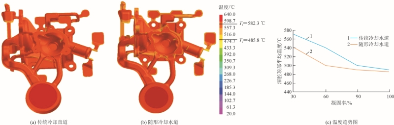 圖8 活塞運動速度與時間關系圖 用模流軟件中的void預測模型充型過程中易出現裹氣的部位,見圖9。可以看出,當鑄件充型70%時最開始填充離內澆口最近的碗形深腔頂部,而在充型80%的時候,深腔頂部和3個圓孔基本充滿,說明充滿深腔頂部的金屬液流速很快,這不利于內部收縮甚至產生縮孔。鑄件充型90%時,除溢流槽和一側邊圓孔外,鑄件內部已經充填完畢,而在充型95%時,只有溢流槽部分未充滿,表明側邊單一圓孔金屬液填充速度過快,容易出現縮孔缺陷。圖10為兩種冷卻水道的鑄件凝固30%時溫度場及溫度趨勢。可見傳統冷卻水道的碗狀深腔溫度約為570℃,而帶有隨形冷卻水道效果更優,深腔邊緣溫度約為540℃,頂部為557℃,在型腔內部能夠避免熱節處出現孤立液相區導致無法補縮的問題,進而避免縮松縮孔缺陷的發生。 圖11為帶有傳統冷卻水道和隨形冷卻水道模具充型凝固完成后的溫度場,將其沿著XY、XZ方向切片,對比模具溫度變化。從沿著XZ切片圖可以看出,在深腔頂部左外表面上和深腔內部溫度隨形水道的冷卻效果優于傳統水道。隨形冷卻水道左表面溫度梯度由少部分溫度區間226.7~268℃轉變為大部分,且深腔內部268.0~309.3℃的溫度呈降低趨勢。圖12為深腔最終凝固時間分布圖。