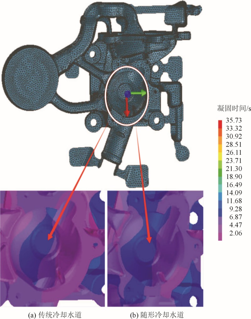圖6 增設隨形冷卻水道方案 首先用UG建立簡易的活塞、壓室和模具,將其連同冷卻水道(傳統冷卻直道和隨形冷卻水道)和水泵壓鑄件(水泵座+流道+料餅+溢流槽)一塊裝配,然后在模流軟件界面進行面網格和體網格劃分。設置鑄件面網格尺寸為1mm,冷卻水道面網格尺寸為1.5mm,活塞、壓室和模具面網格尺寸為4mm。帶有傳統冷卻直道的有限元模型面網格數量為127076,體網格數量約為245萬,帶有隨形冷卻水道的有限元模型面網格數量為129052,體網格數量約為233萬。有限元模型見圖7。模擬的工藝參數包括澆注溫度為640℃,模具預熱溫度為240℃,活塞快壓射速度為3 m/s,慢壓射速度為0.3m/s,壓室高度為300 mm,可以得到快壓射時間為0.018s,慢壓射時間為0.818s。其活塞運動速度與時間曲線見圖8。