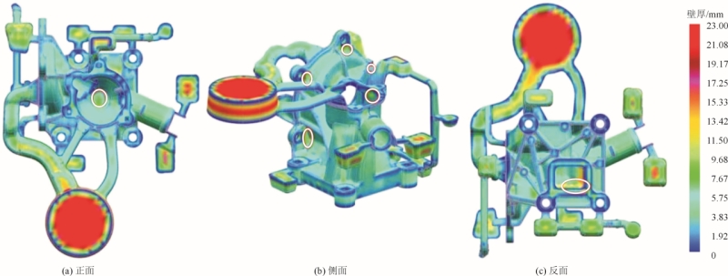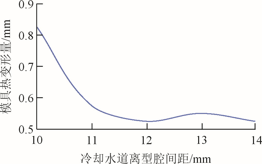 圖3 水泵壓鑄件三面壁厚 針對于碗形深腔頂部增加水道設計,見圖4。該處連接著兩個內澆口,是除了料餅之外,最早受到金屬液充型的地方。其頂部壁厚也是整個水泵座最厚的部位之一,需要在此處設計冷卻水道,避免鑄件表面的翹曲變形和內部縮松縮孔缺陷的發生。設計水道直徑過大會使流速變慢,雷諾數降低,傳熱系數降低。過小會導致流速變快、冷卻水道間隔太小,導致散熱不好,進而導致產品局部產生缺陷。 (1)傳統冷卻水道方案 采用直線型,通常是直接在模板和模芯中鉆孔得到,具有結構簡單、加工成本低等特點。原有的冷卻系統就是針對水泵壓鑄件大壁厚部位布置的冷卻水道,共有6條直通水道。在原有傳統冷卻系統基礎上,根據深腔頂部中空的結構特征,增設傳統冷卻直道(圖4中圓圈標注)。 (2)隨形冷卻水道方案 由于深腔頂部的結構復雜,傳統冷卻直道無法在內腔進行有效布局,進而無法獲得均勻的溫度梯度,影響了鑄件品質。為了解決這個問題,在模具水冷鑲塊內腔增設隨形冷卻水道。冷卻水道的建模大致分為:確定冷卻水道的尺寸和傳熱系數、確定水道中心線和生成冷卻水道。 圖5為水道離型腔間距與模具熱變形量關系圖。可以看出,控制水道離型腔間距在11~13mm之間,模具熱變形量趨于極小值,能夠有效平衡熱梯度以及提高模具使用次數。