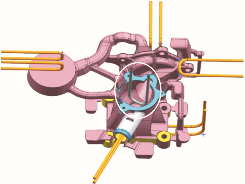 圖2 水泵壓鑄件三維模型及壓鑄模