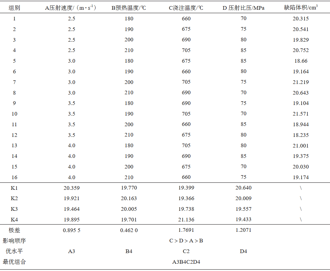 表3 正交試驗因素水平表 本試驗方案需要進行16組正交試驗,基于試驗方案中提供的數(shù)據(jù),對殼體的充型與凝固過程進行模擬。并對以上16組數(shù)據(jù)的鑄件縮松、縮孔等缺陷體積大小進行統(tǒng)計對比,最后得到正交試驗數(shù)據(jù)如表4所示。